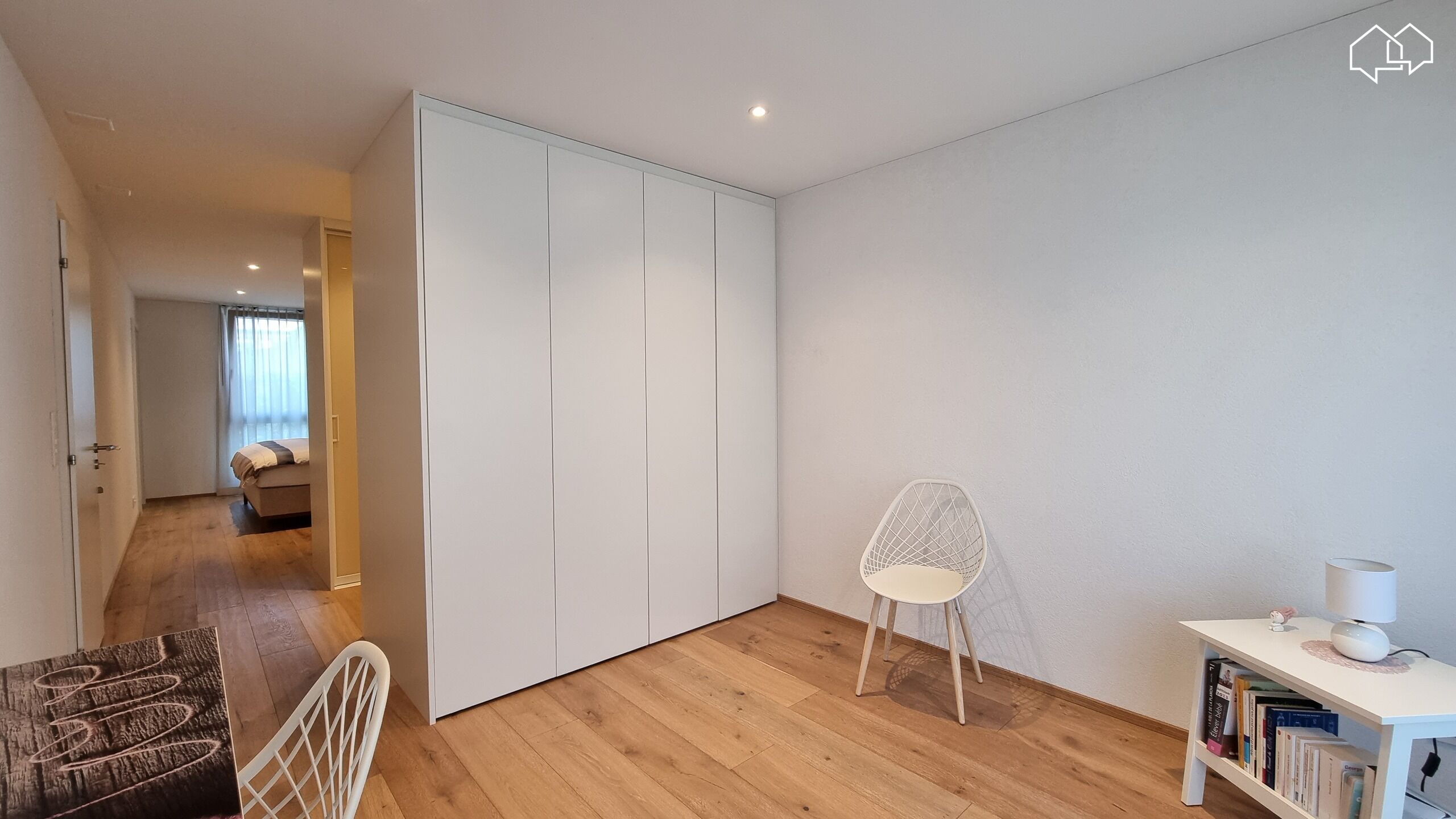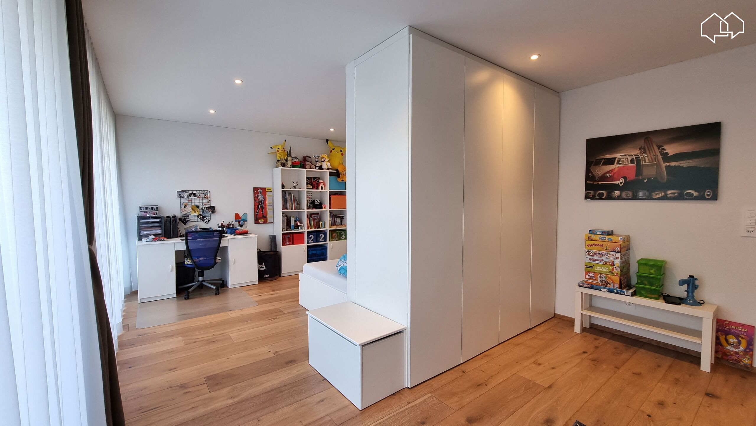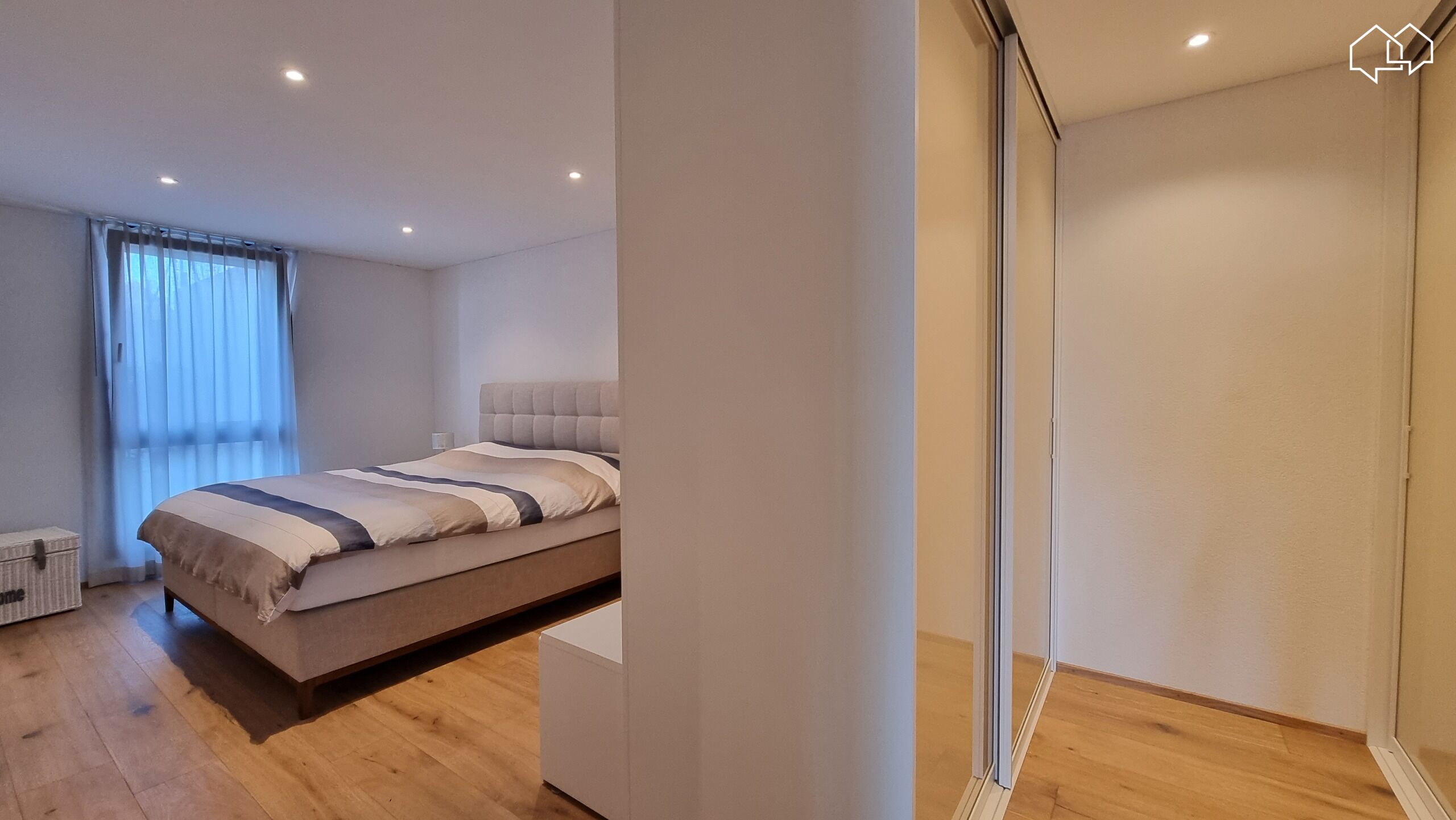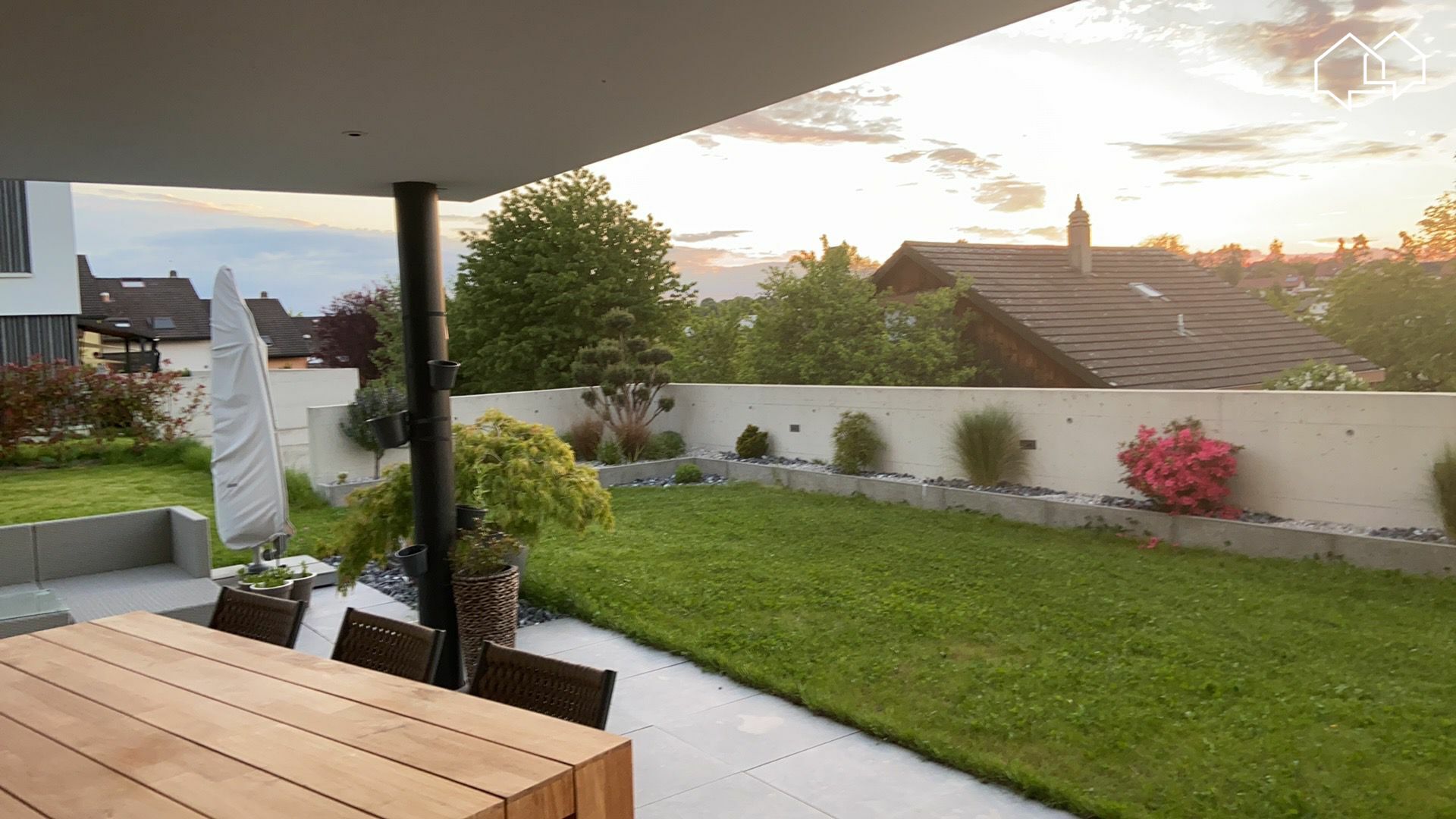 Initialement prévu en 5.5pces, cet appartement a été modifié en 3.5pces et nécessite de petits travaux pour le modifier en 4.5pces. Situé au rez de chaussée, il a l'avantage de profiter d'une grande terrasse couverte de 60m² et d'un jardin privatif d'environ 450m². Sobre et contemporain, le beau parquet qui habille l'appartement apporte une touche chaleureuse. La cuisine très bien équipée est prolongée par un économat.