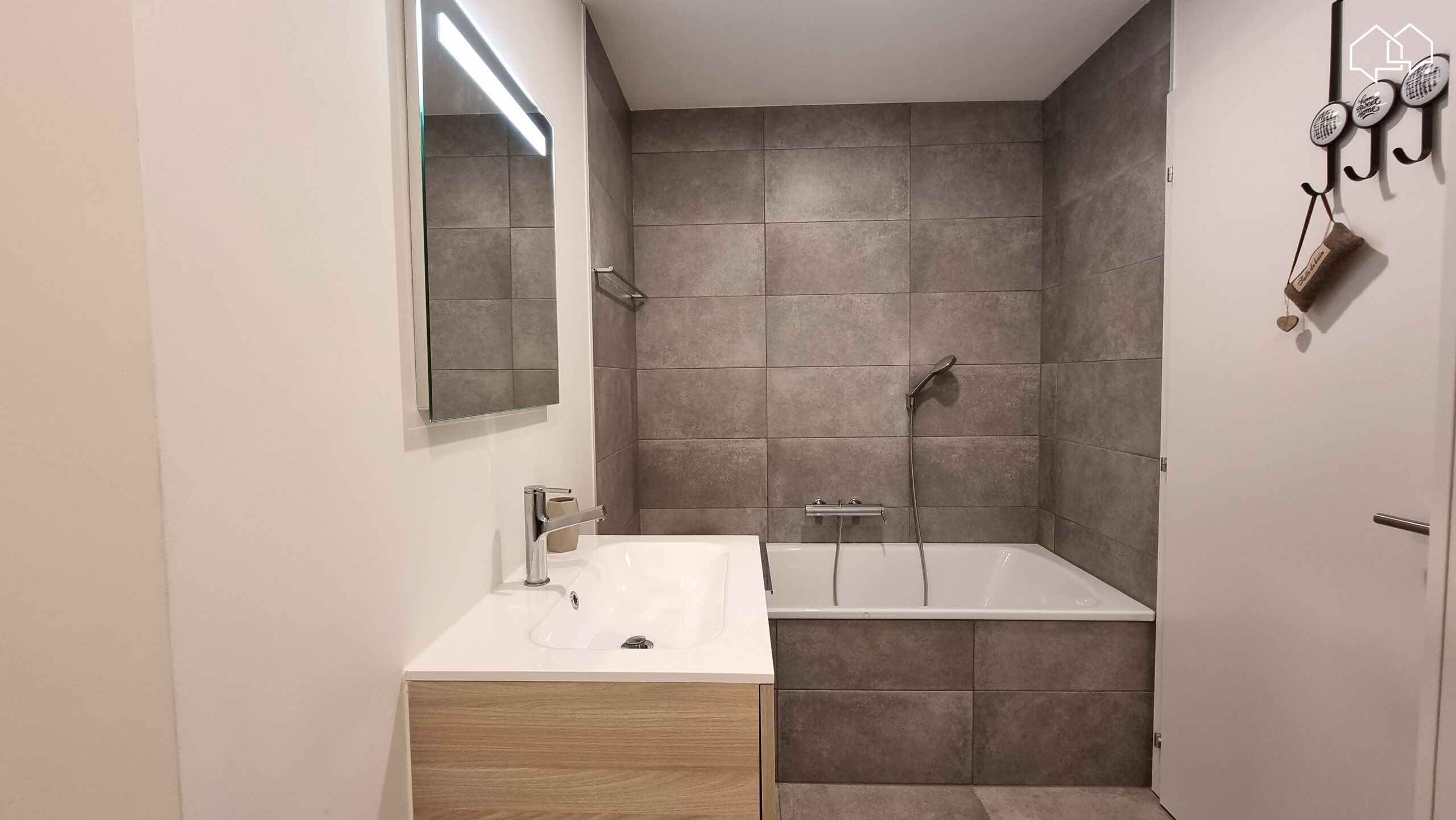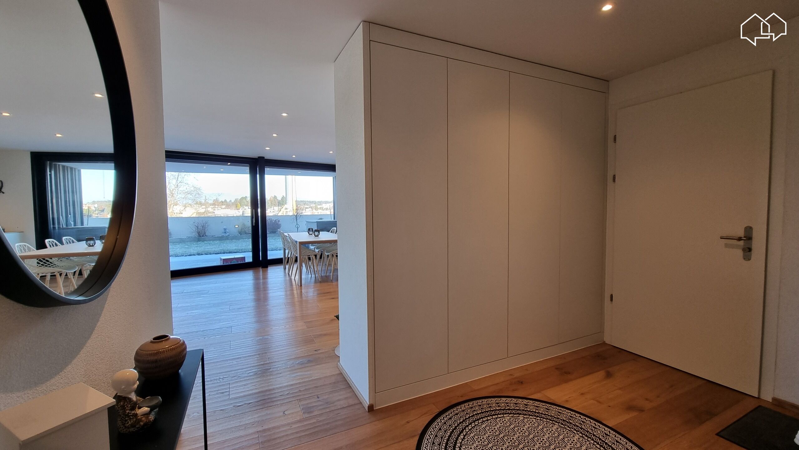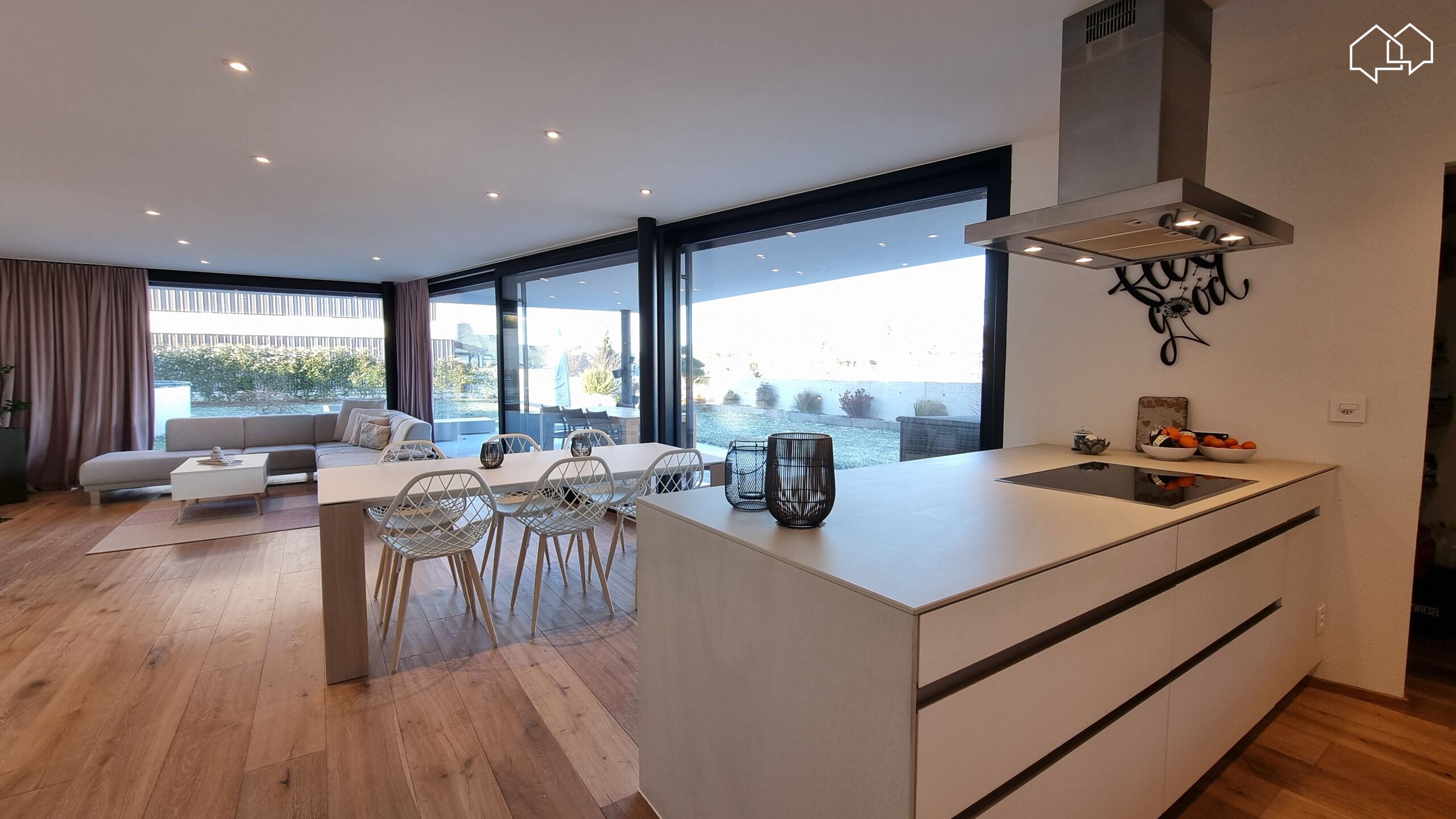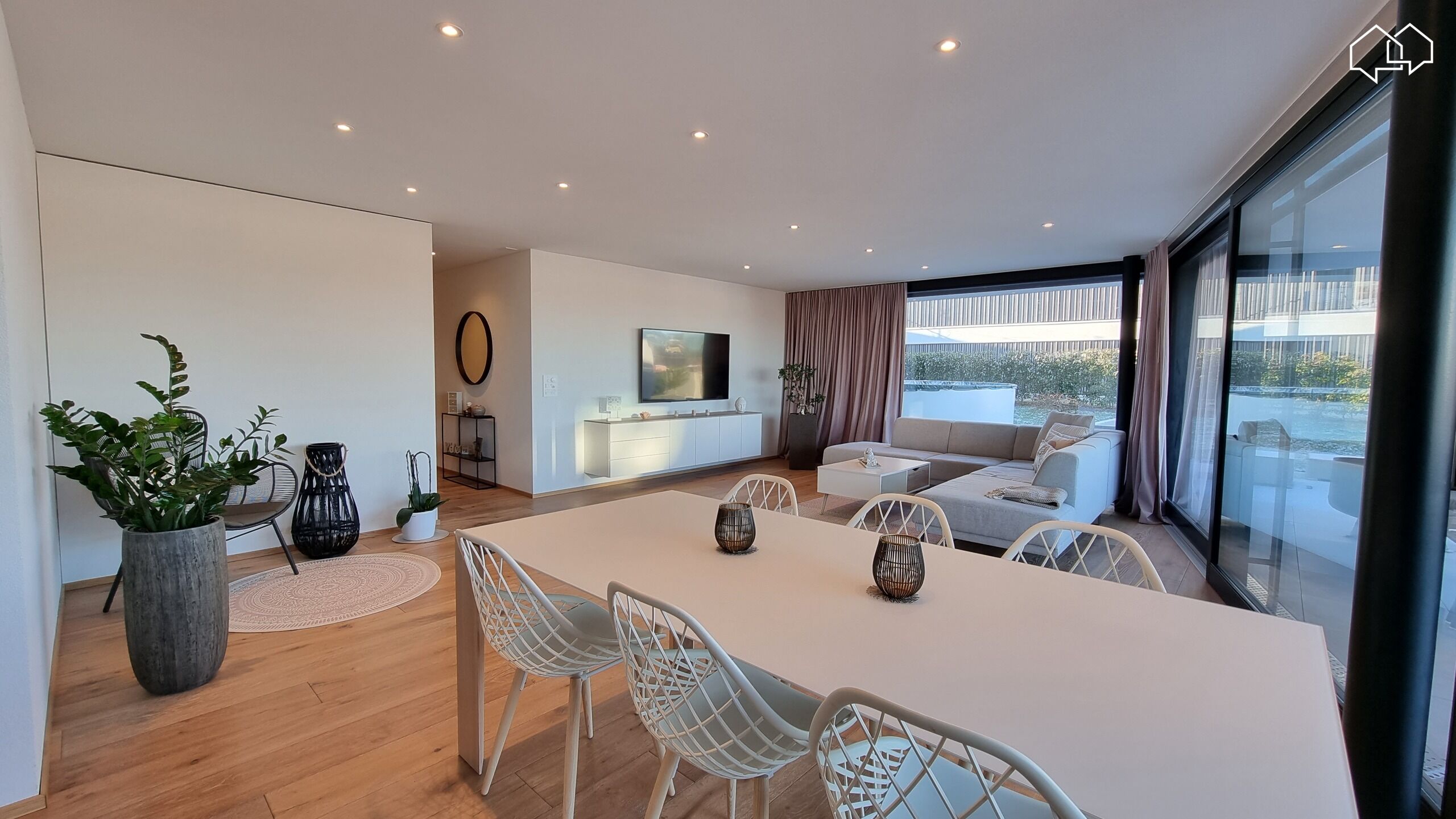 Initialement prévu en 5.5pces, cet appartement a été modifié en 3.5pces et nécessite de petits travaux pour le modifier en 4.5pces. Situé au rez de chaussée, il a l'avantage de profiter d'une grande terrasse couverte de 60m² et d'un jardin privatif d'environ 450m². Sobre et contemporain, le beau parquet qui habille l'appartement apporte une touche chaleureuse. La cuisine très bien équipée est prolongée par un économat.