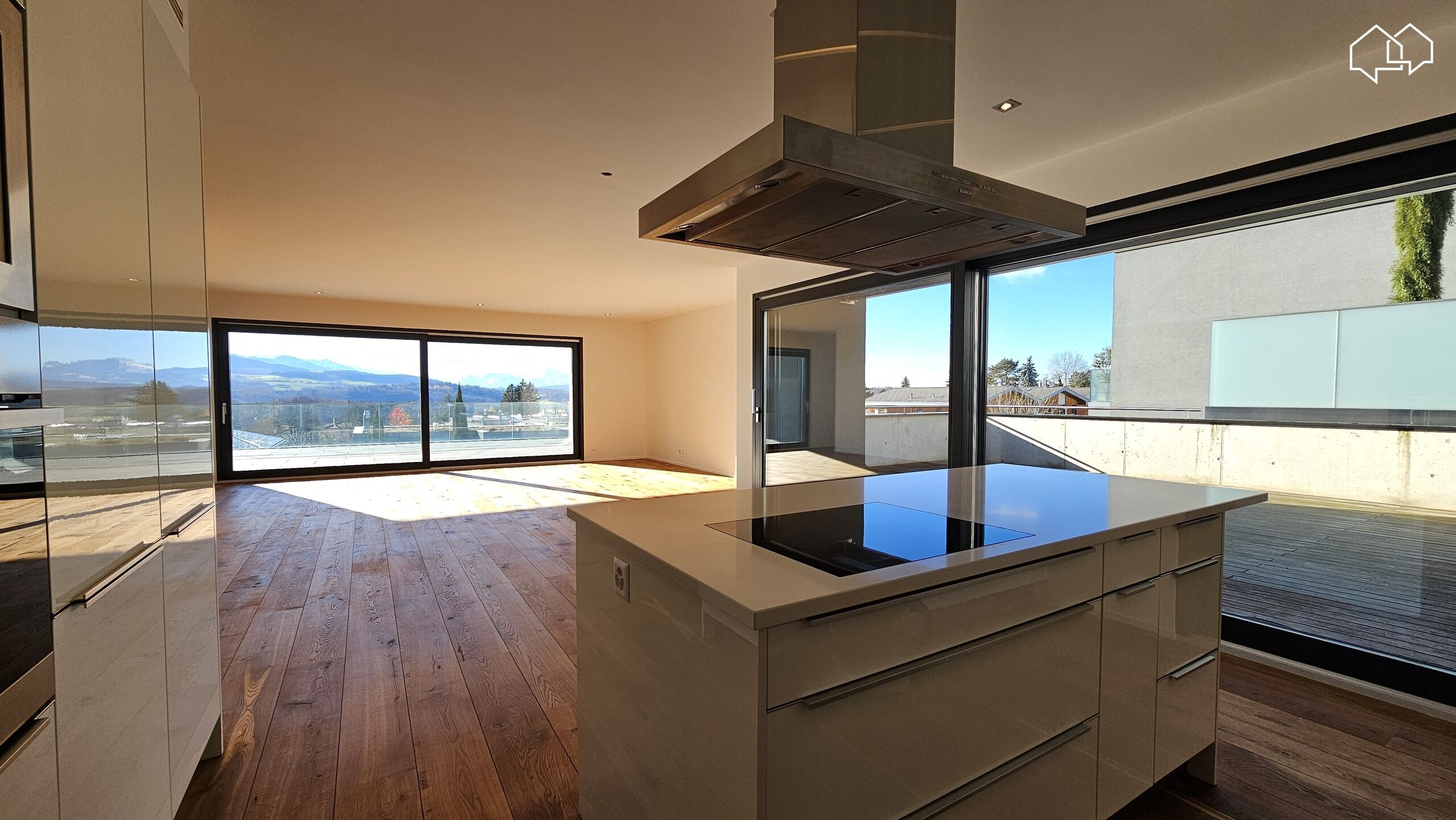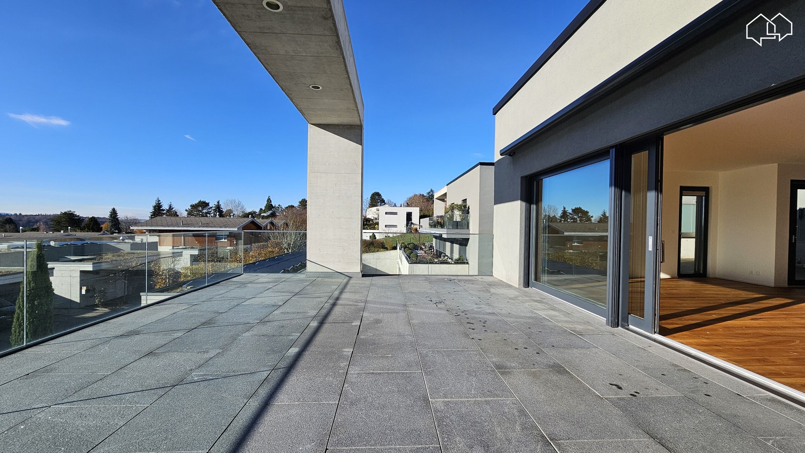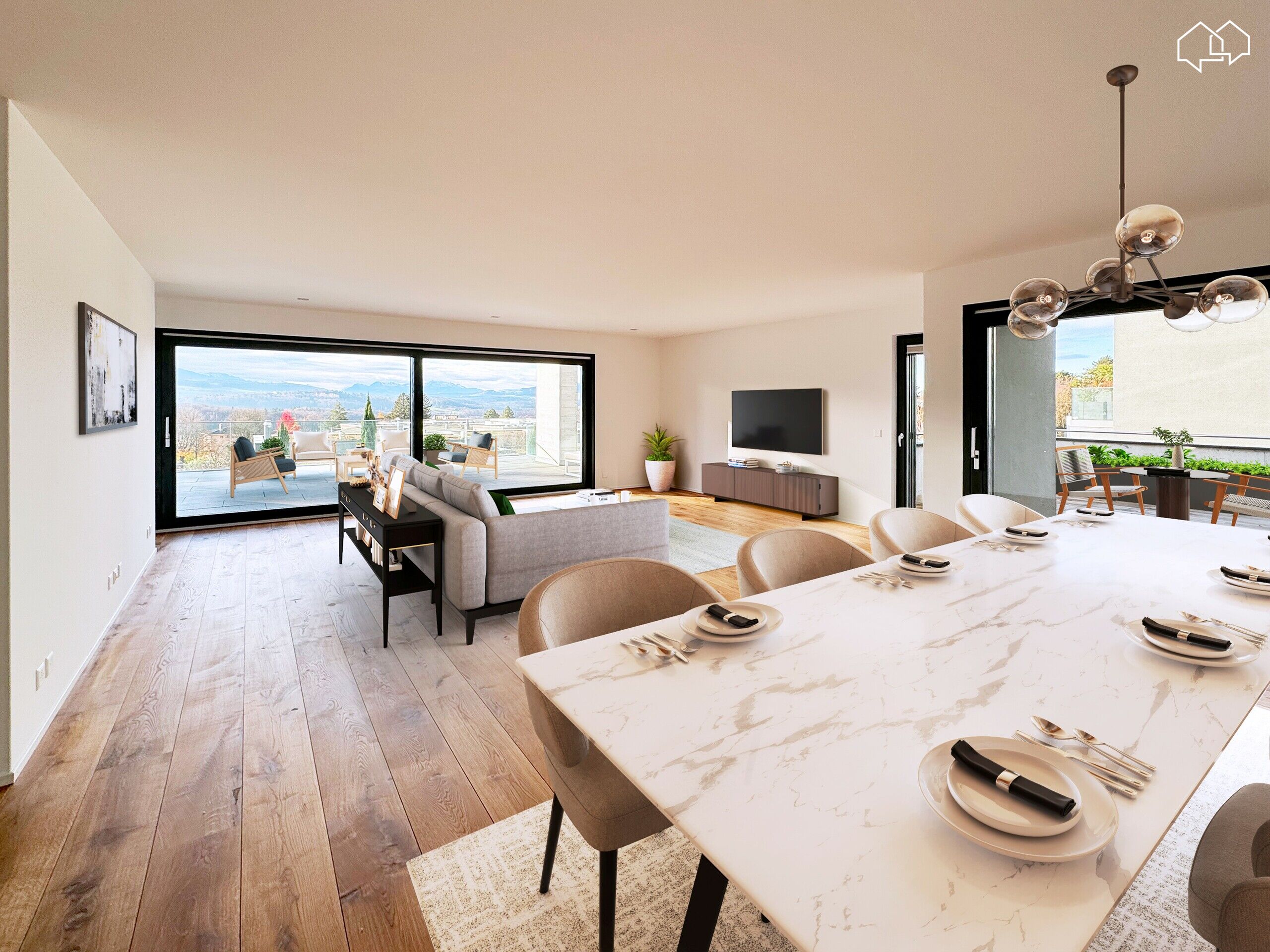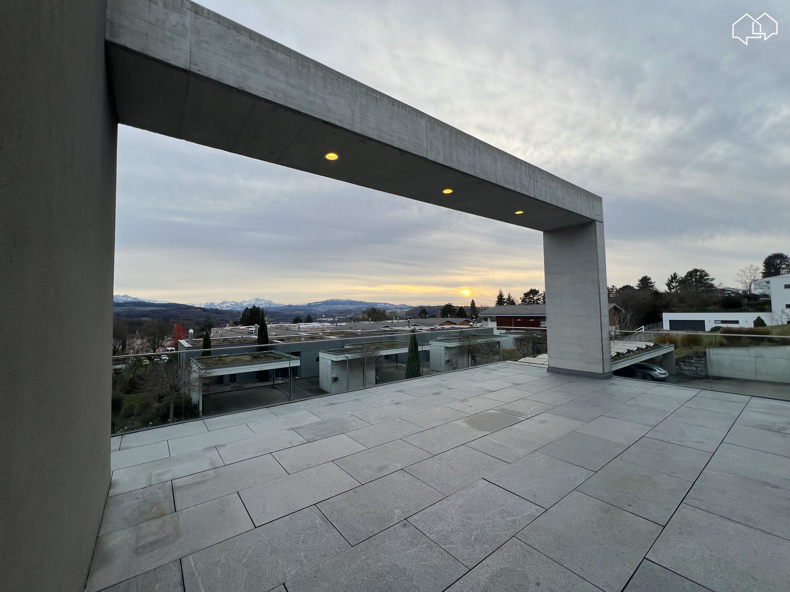 Deux terrasses orientées pour l'une au sud et pour l'autre à l'ouest permettent de profiter d'un ensoleillement tout au long de la journée et d'une vue imprenables sur les Préalpes.