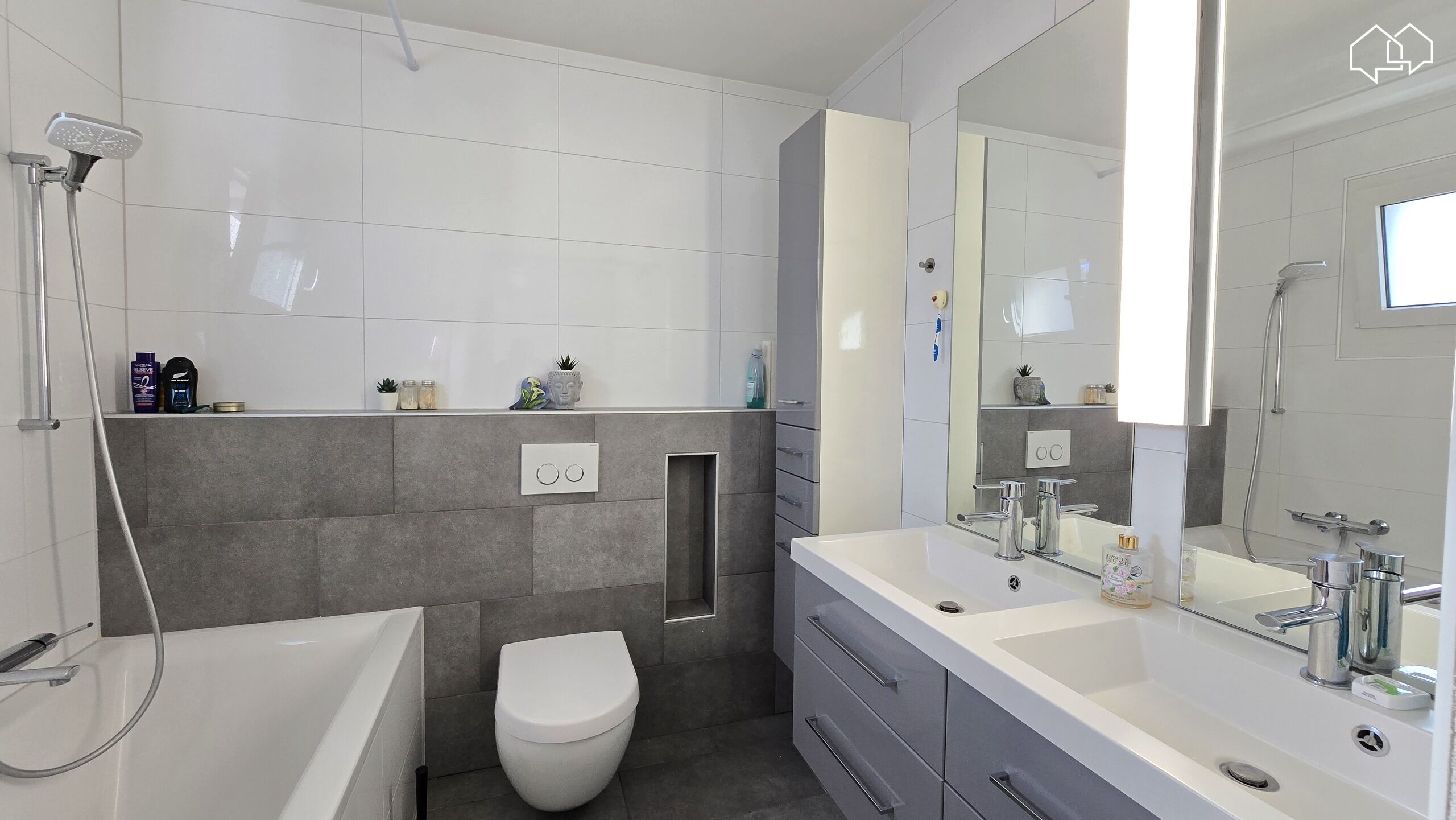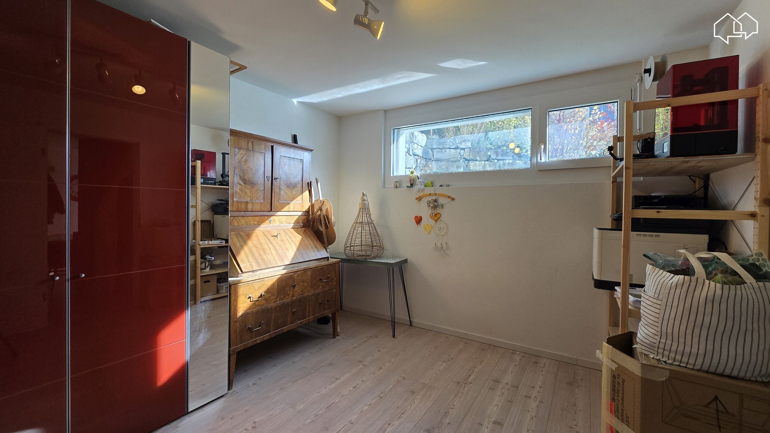 L'entrée se fait par le rez inférieur situé au même niveau que le garage double et son réduit ainsi que le local technique/buanderie et une pièce supplémentaire idéale pour un bureau.