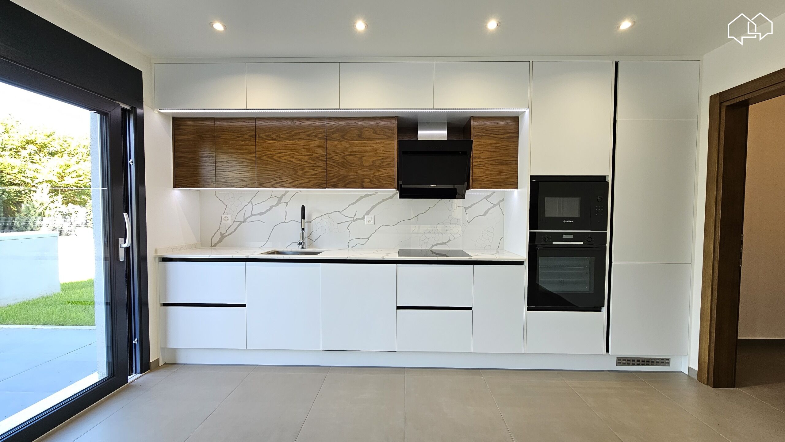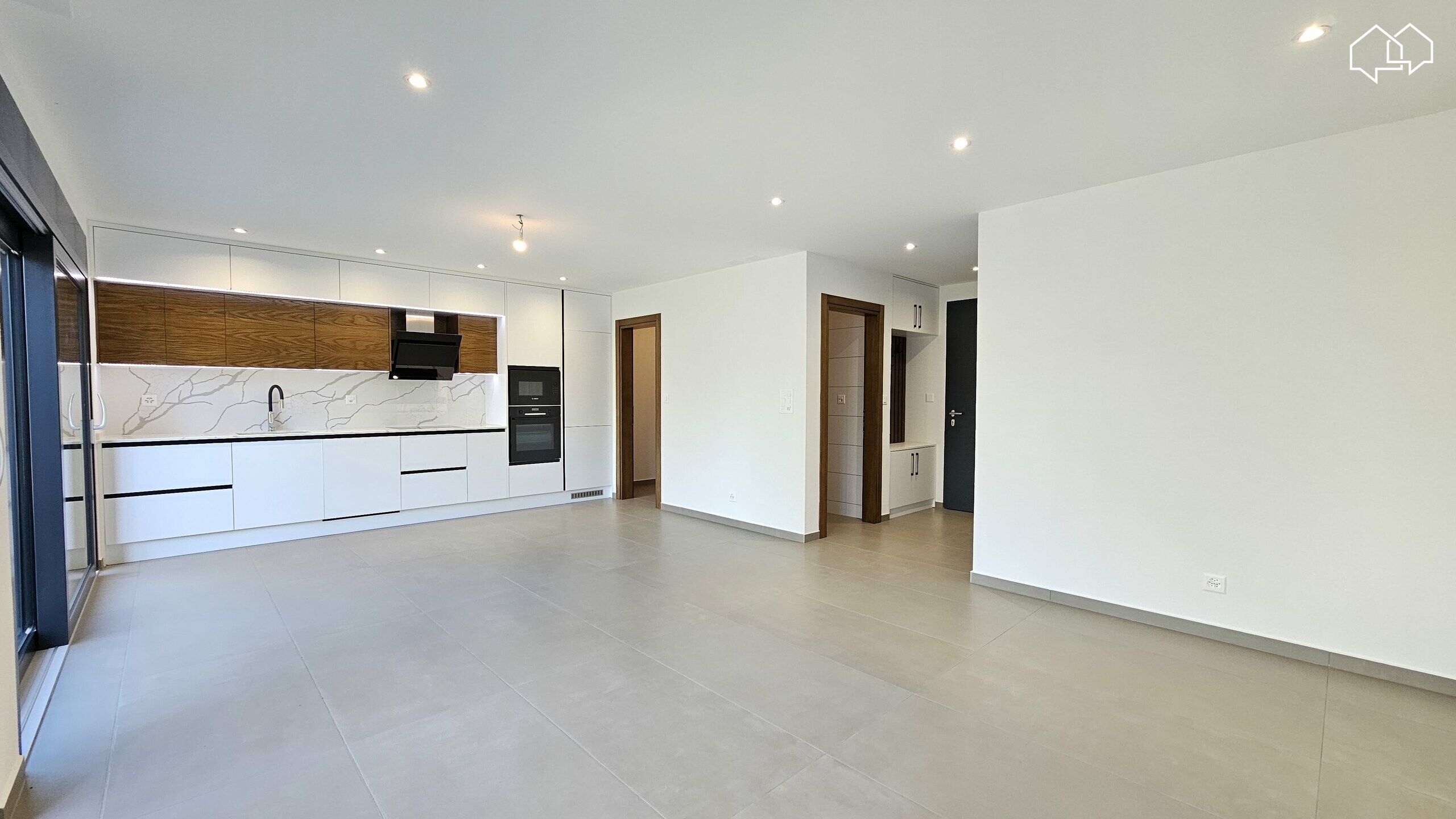 La pièce de vie située au rez-de-chaussée est composée d'une cuisine ouverte sur le séjour, d'un économat et d'un wc visiteurs et donne accès à un grand jardin privatif. L'étage dispose de 3 chambres et 2 salles de bains.